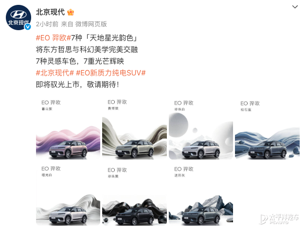 10月2日,北京现代官方发布了全新纯电SUV“EO羿欧”的七款配色,官方将其称为“天地星光韵色”,诠释东方哲思与科幻美学的完美交融。